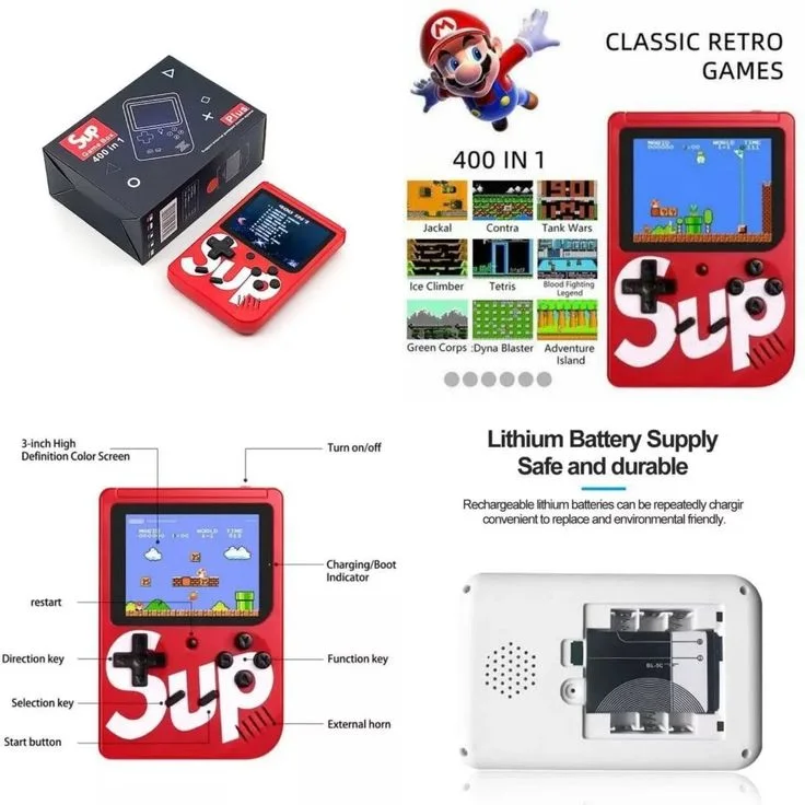 أعد اكتشاف متعة الألعاب الكلاسيكية مع جهاز ألعاب SUP. يتميز بشاشة LED بحجم 3 إنش و400 لعبة مدمجة. مثالي للأطفال والمعجبين بالألعاب الكلاسيكية.